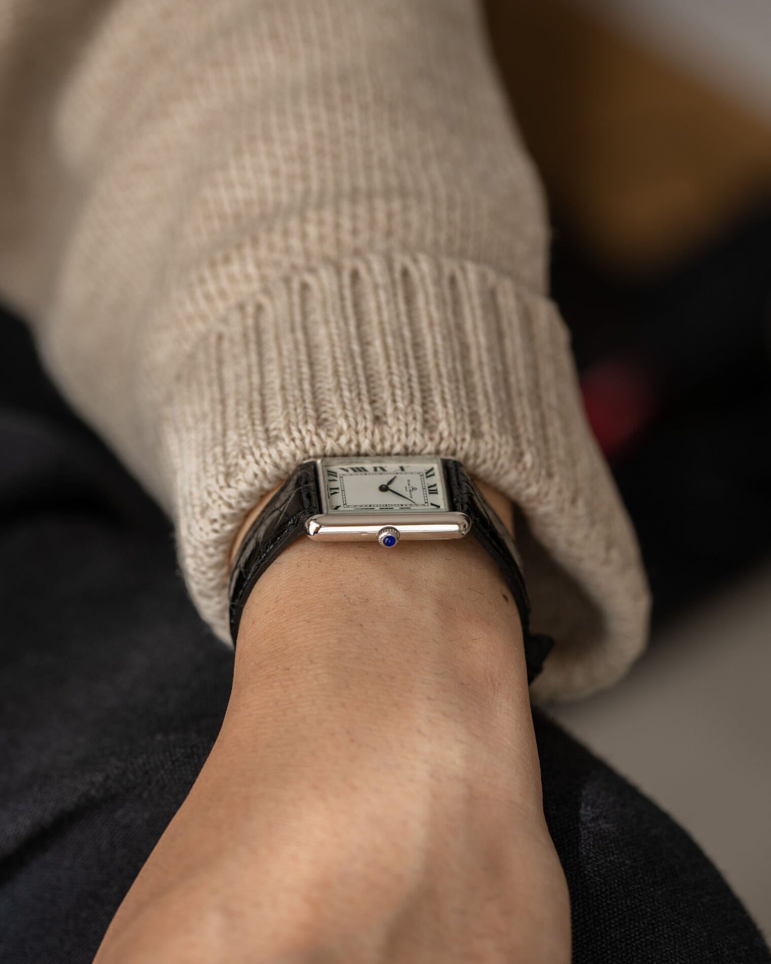 The case material is 18K white gold. A rectangle case reminiscent of a Cartier tank. The crown is set with a cabochon-cut blue sapphire.