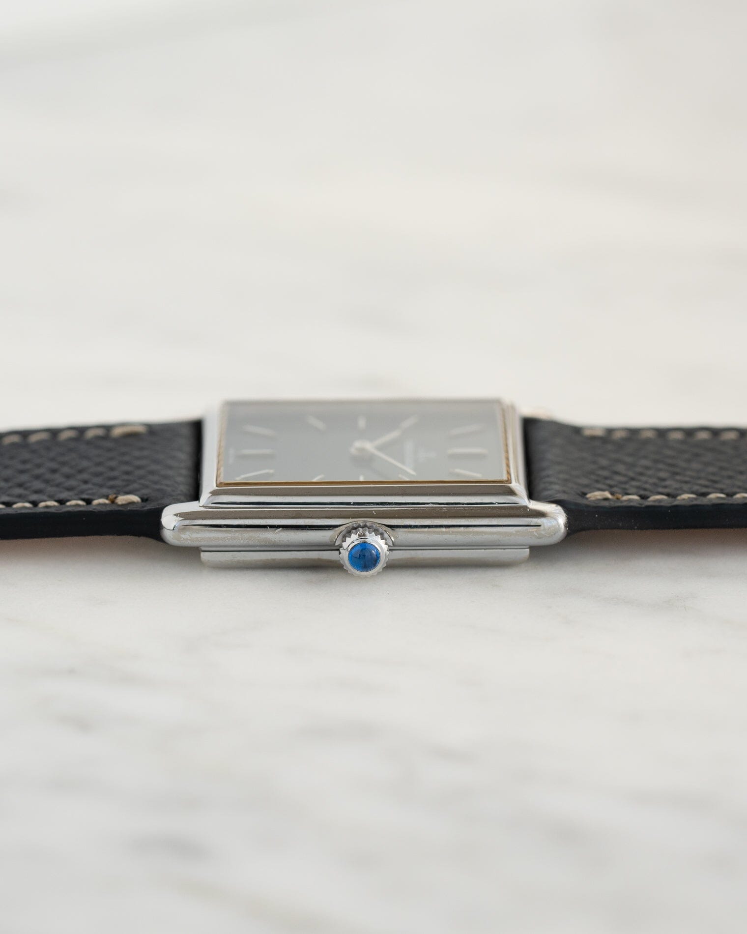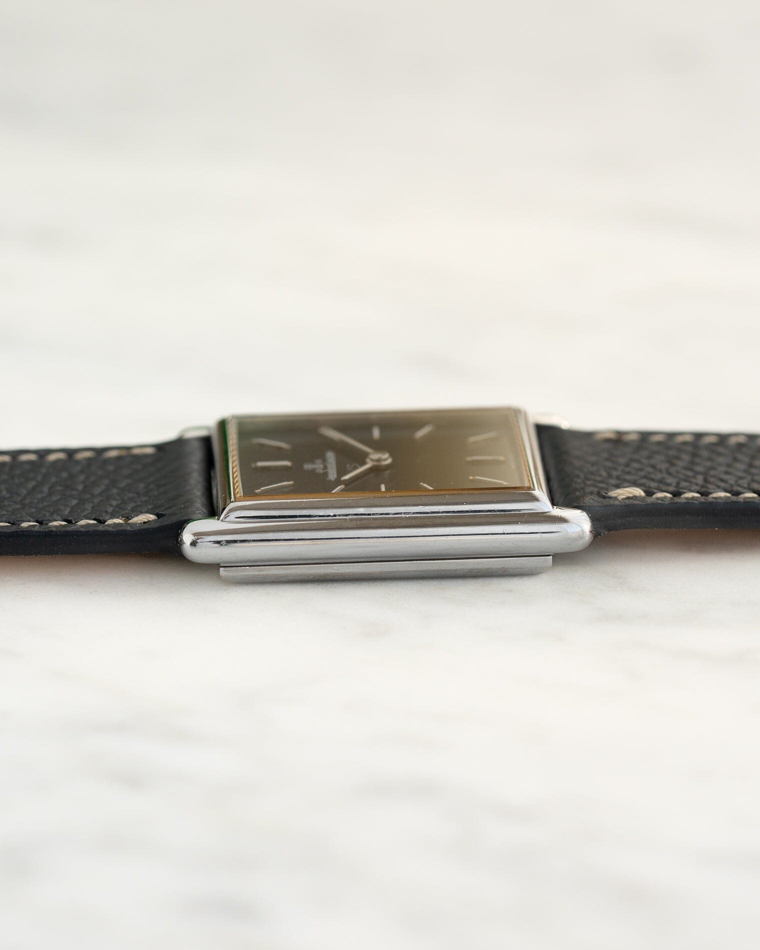 This reference 6029.22 is a manual wind dress watch from the 1970s. The case is made of 18K white gold and has a rectangular shape reminiscent of a Cartier tank.