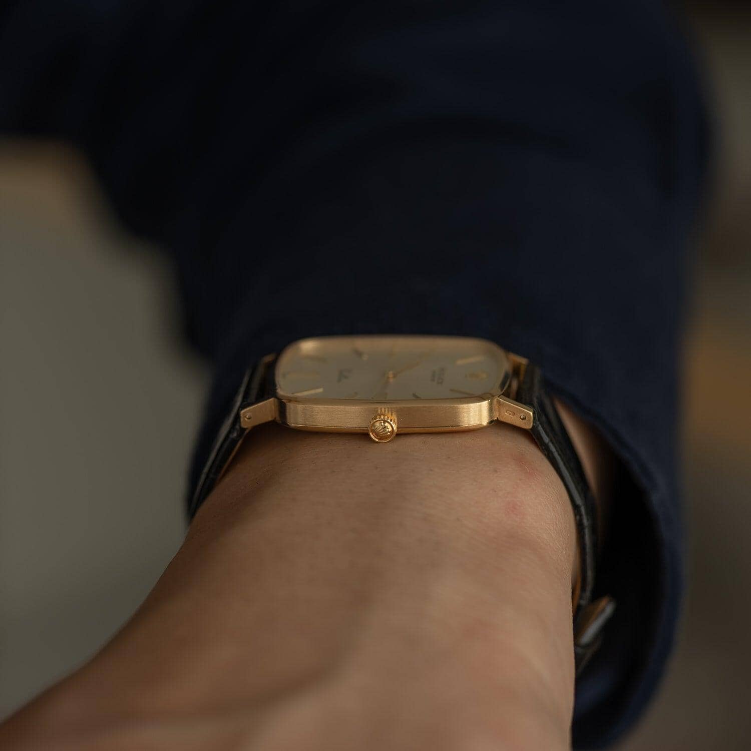 This reference 4113 is an 18K yellow gold watch with a rounded rectangular case.