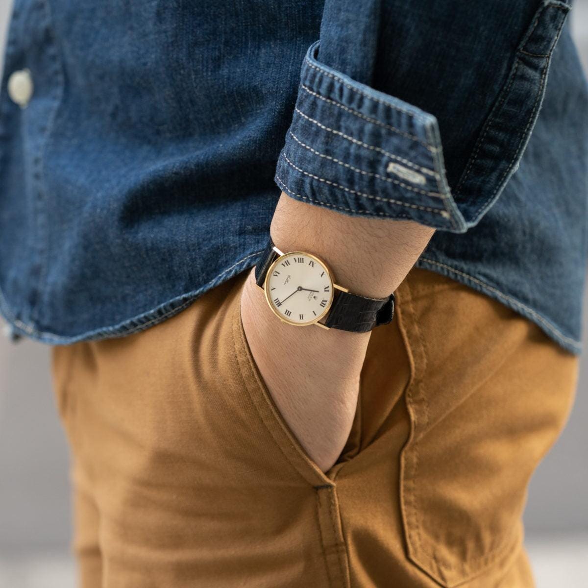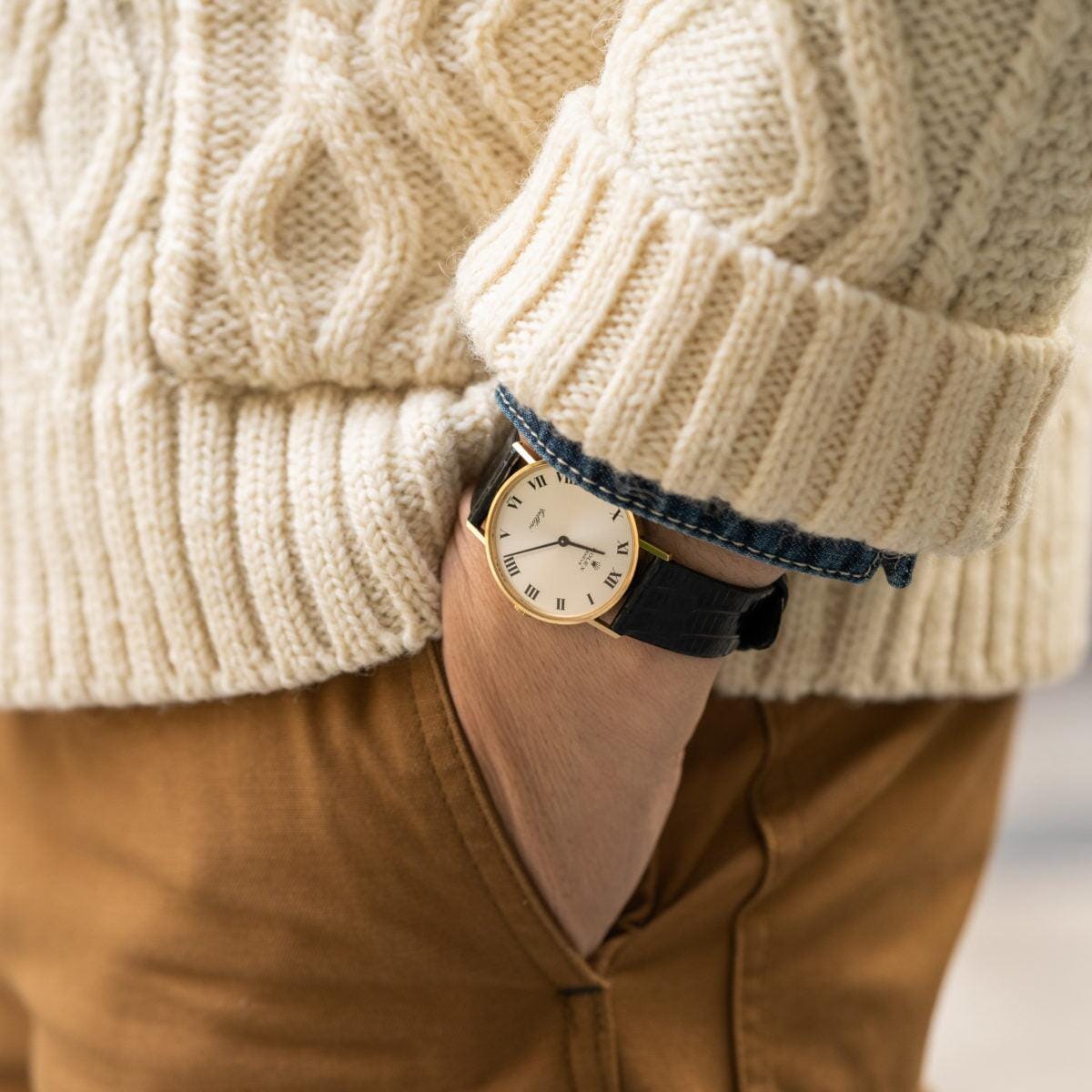 18Kイエローゴールドケースにシルバーのローマンダイアルという小洒落たデザインです。