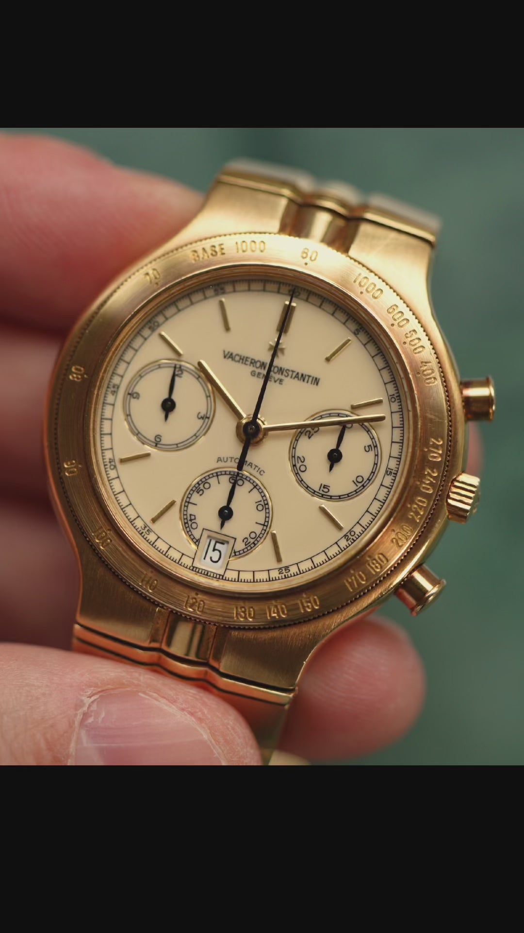 This example has an 18k yellow gold case and bracelet and a glossy ivory dial, a combination rarely seen.